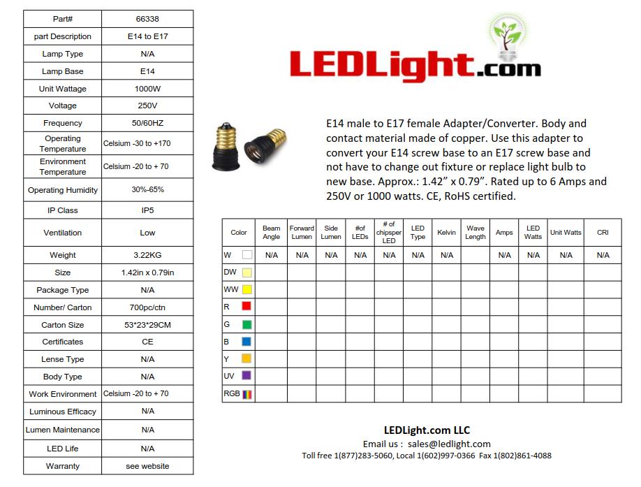 E14 male to E17 female Adapter/Converter. Body and contact material made of copper. Use this adapter to convert your E14 screw base to an E17 screw base and not have to change out fixture or replace light bulb to new base. Approx.: 1.42” x 0.79”. Rated up to 6 Amps and 250V or 1000 watts. CE, RoHS certified.