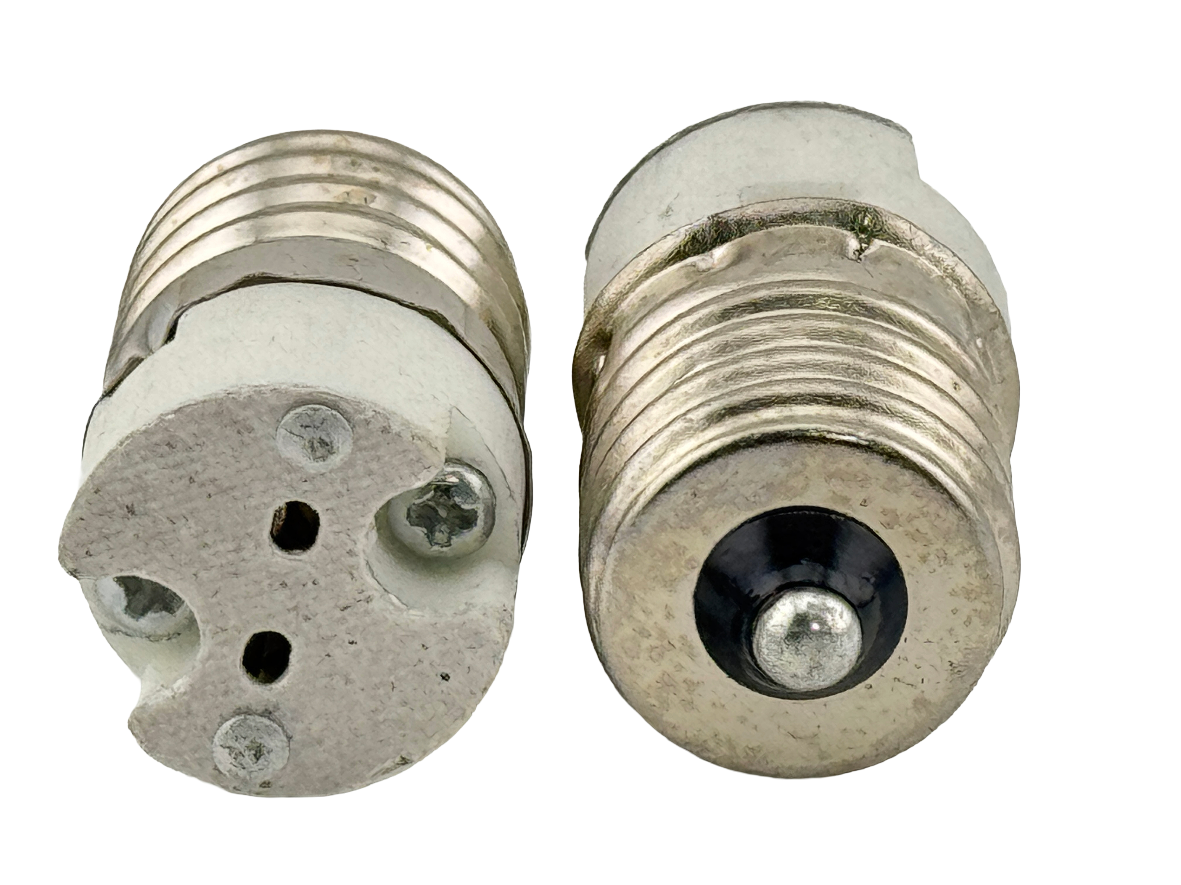 E26/E27 male to GX4.0, GU4.0, GX5.3 G4, GY6.35 MR11, MR16 female Adapter Converter. Use this adapter to convert G4, MR11 and MR16 products to E27 base. This converter can work with low voltage and line voltage up to 220 VAC.