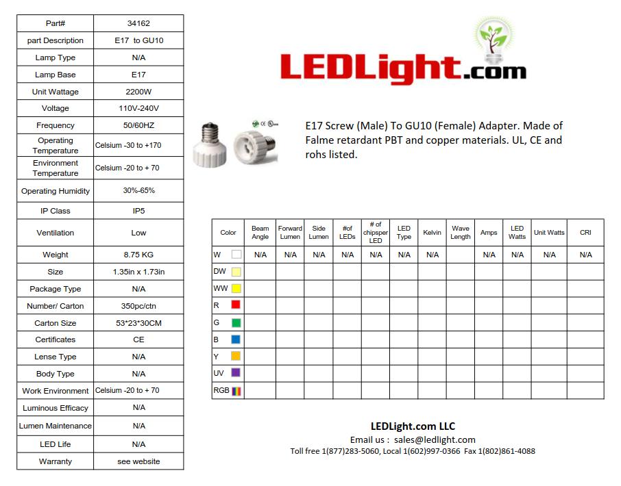 E17 Screw (Male) To GU10 (Female) Adapter. Made of Falme retardant PBT and copper materials. UL, CE and rohs listed.