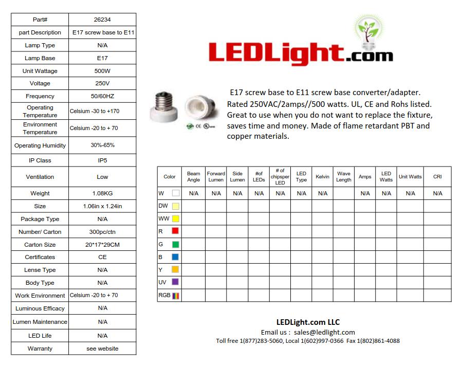 E17 screw base to E11 screw base converter/adapter. Rated 250VAC/2amps//500 watts. UL, CE and Rohs listed. Great to use when you do not want to replace the fixture, saves time and money. Made of flame retardant PBT and copper materials.