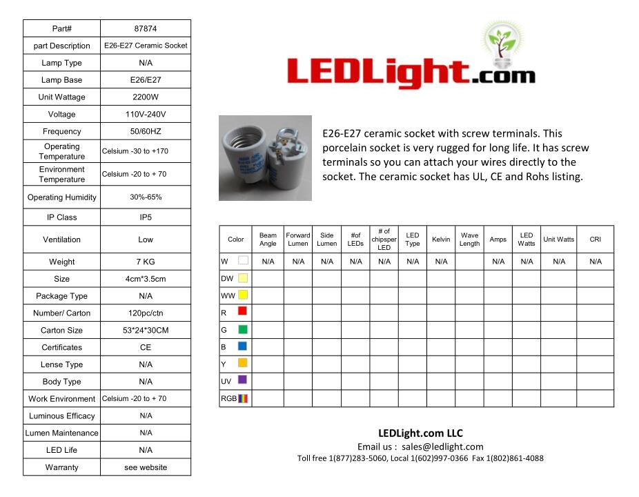 E26-E27 ceramic socket with screw terminals. This porcelain socket is very rugged for long life. It has screw terminals so you can attach your wires directly to the socket. The ceramic socket has UL, CE and Rohs listing. Rated up to 250V, 660W. compatible with: