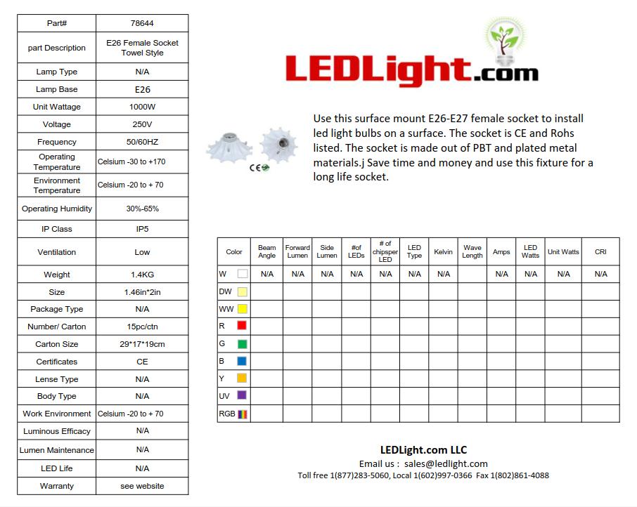 Use this surface mount E26-E27 female socket to install led light bulbs on a surface. The socket is CE and Rohs listed. The socket is made out of PBT and plated metal materials.j Save time and money and use this fixture for a long life socket.