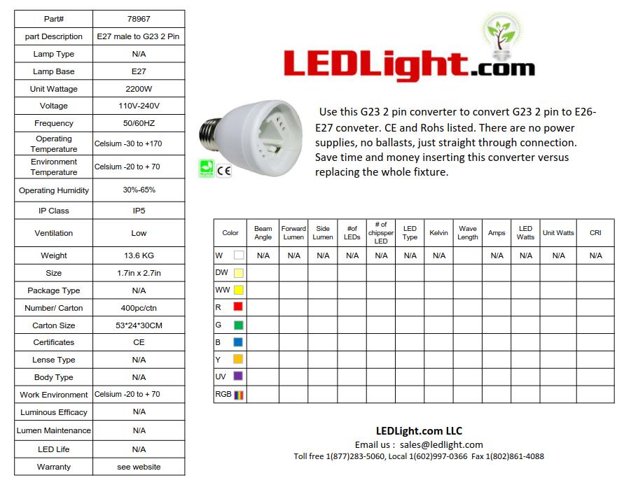 Use this G23 2 Pin male 2 pins adapter to E27 female Converter. Great to use on LED Bulbs or CFL or fluorescent lighting. CE, Rohs certifications. The socket is LED common base which fits both G23 and G23-2 sockets |