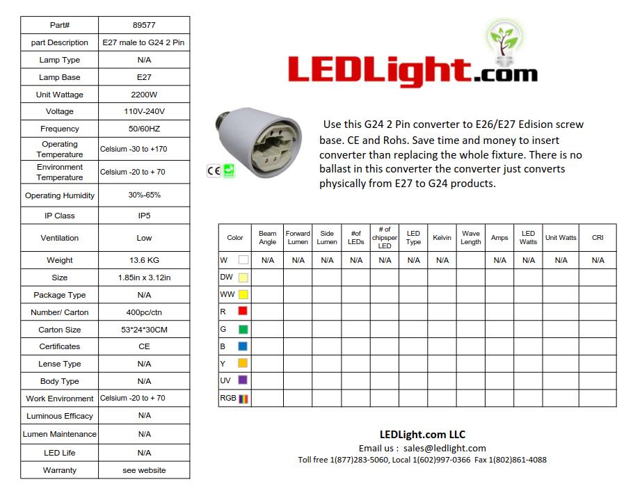Use this E26/E27 Edison screw base male to G24 2 Pin female converter ceramic to . CE and Rohs. Save time and money to insert converter than replacing the whole fixture. There is no ballast in this converter the converter just converts physically from E27 to G24 products. Fits G24q-2.
