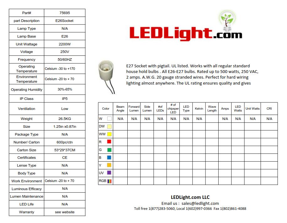 E26 or E27 Socket with pigtail. UL listed. Works with all regular standard house hold bulbs. All E26 or E27 bulbs. Rated up to 500 watts, 250 VAC, 2 amps. This socket can be used with low voltage as long as you do not exceed the maximum power rating of 500 watts. . The wire is A.W.G. 20 gauge stranded wires. Perfect for installing wiring for lighting almost anywhere. The UL rating ensures quality and gives peace of mind. Save money and easier to replace this socket than to replace the whole fixture. Wires are approximately 5" in length. The socket is made of ceramic with copper plated metal contacts. Can be used for both line voltage or low voltage as long as you do not exceed 500 watts. Compatible with: Mfr. Model Number 462401, 463601, 464201, 462402, 463002, 463602, 464202, 462408, 463008, 463608, 464208, 462404, 463004, 463604, 464204, 462423, 463023, 463623, 463011, 463611, 464211, 463018, 463618, 464218, 462422, 463022, 463622, 464222, 463001