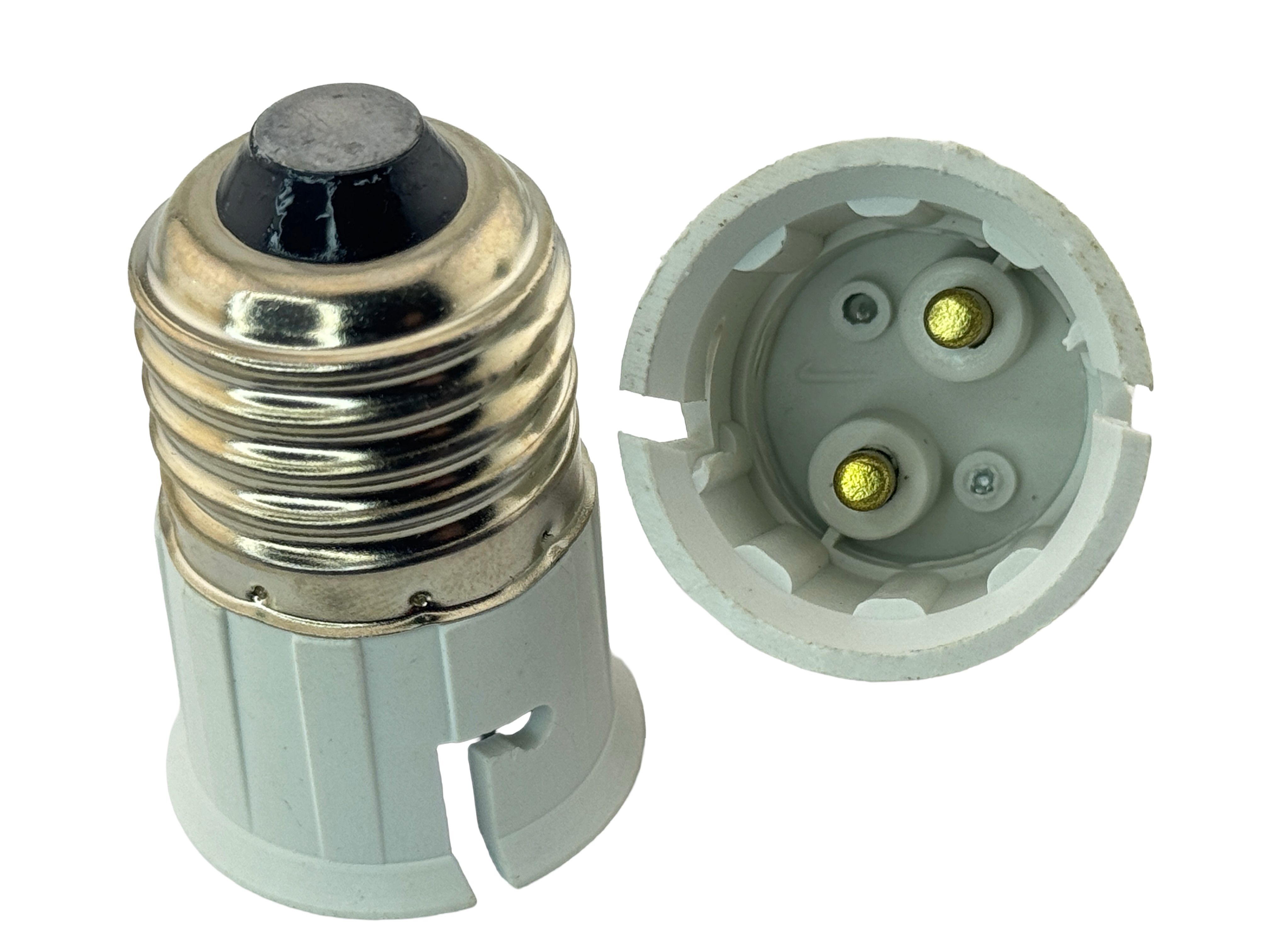 Rebaydo 2pcs E26/E27 (Male) to B22 (Female) converter adapters allow fixtures with an E26/E27 Edison screw base to accept B22 bayonet base bulbs, enabling use of different bulb types without replacing the existing socket. The adapter contains no electronics and transfers power directly through two internal metal conductors for a simple and reliable connection. Rated for 2200 W, 220 V, and up to 10 A, it operates in temperatures from approx. -22°F to approx. 338°F with a working environment of approx. -4°F to approx. 158°F and 30%–65% humidity. The adapter carries an IP5 rating for low-ventilation areas. Maximum overall length is approx. 1.95 in and maximum overall diameter is approx. 1.23 in. Two converter adapters are included per order and each unit is tested before shipment.