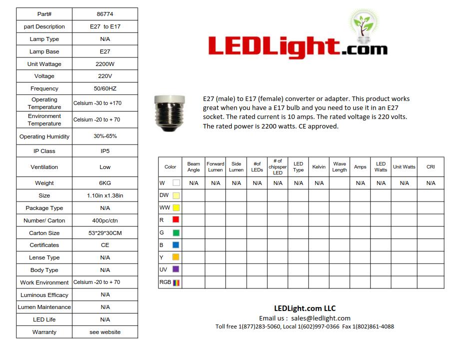E26 E27 male to E17 female converter or adapter. This product works great when you have a E17 bulb and you need to use it in an E27 socket. The rated current is 10 amps. The rated voltage is 220 volts. The rated power is 2200 watts. CE approved. Can be used with incandescent bulbs as long as they are under the rated power of 2200 watts.