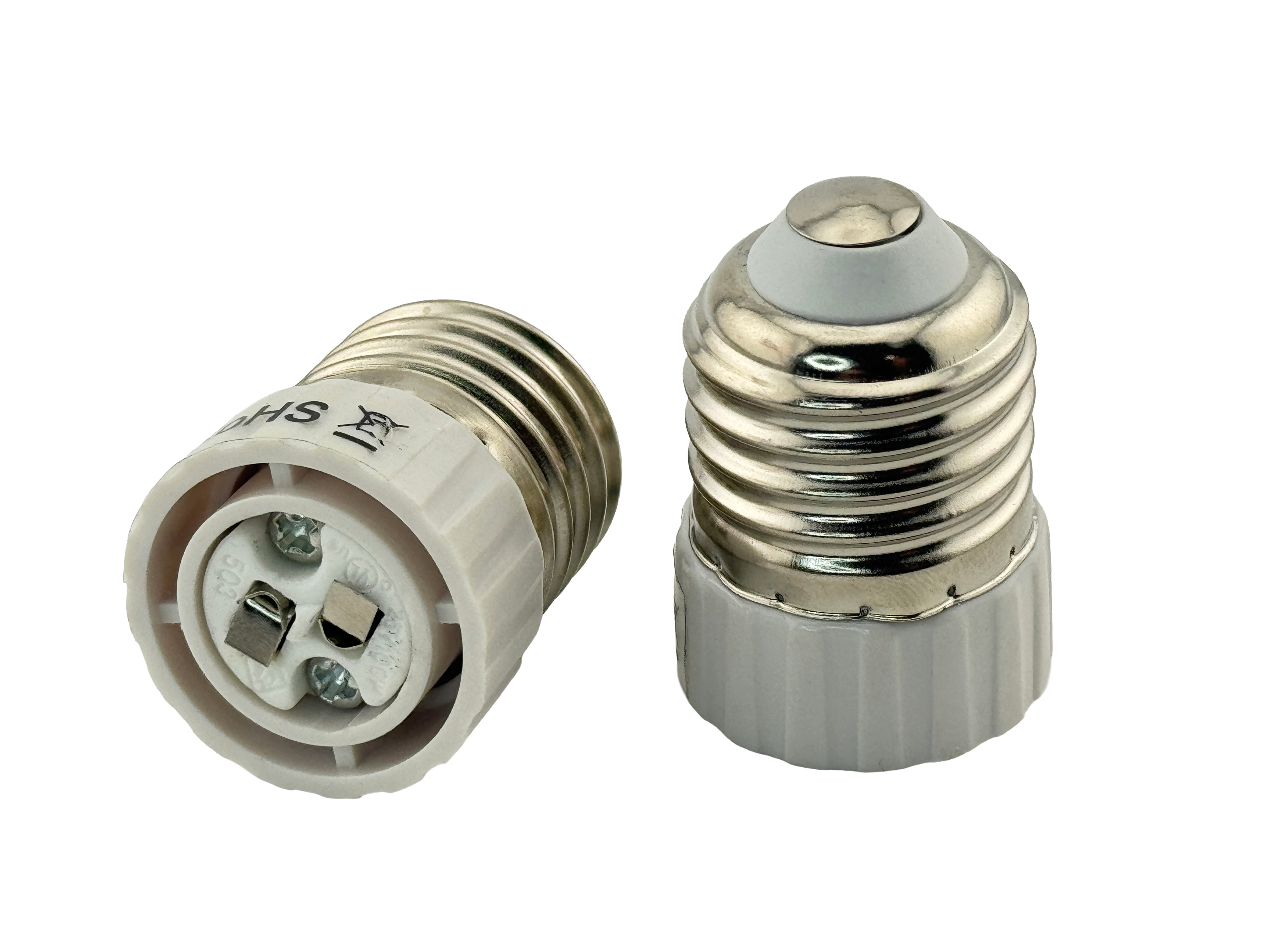 E26 / E27 male to GX5.3 G4 female 6.35 female, MR11 female, MR16 female Adapter Converter. Use this adapter to convert G4, MR11 and MR16 products to E27 base. The mini bi-pin converter rated power is 2200 watts, 10 amps, and 220 volts max. This converter measures approximately 1.69 inches by 1.09 inches. This converter does not have a ballast or power supply, it just provides electrical connection from MR16 to E27. The adapter is made of ceramic to handle heat better in the center. The outside cosmetic ring is made of plastic materials. Medium base to mr11 socket.