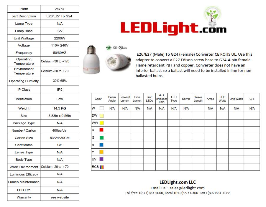 E26/E27 male to G24 4 Pin and G24 2 Pin female converter. Use this adapter to adapt a male E27 Edison screw base to G24-4-pin female or E27 base to G24 2 pin female. Flame retardant PBT and copper. Converter does not have an interior ballast so a ballast will need to be installed inline for non ballasted bulbs. CE ROHS. Rated 500 Watts, 250 VAC, 2 Amps. This converter connects the wires from the E26/27 to the G24 socket so what voltage you screw this converter into is the same voltage as the G24 will provide to the bulb. Compatible with: