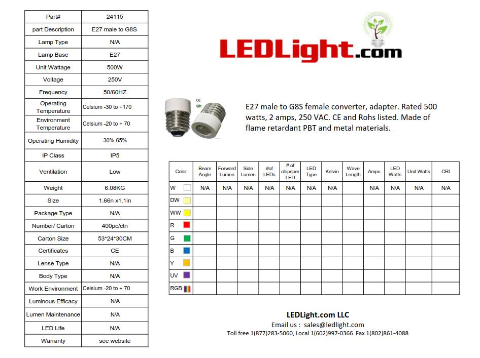 E27 male to G8 female converter, adapter. Rated 500 watts, 2 amps, 250 VAC total power 500 Watts. CE and Rohs listed. Made of flame retardant ceramic and metal materials. The spacing between the holes in 8mm. E26 male or E27 male works.