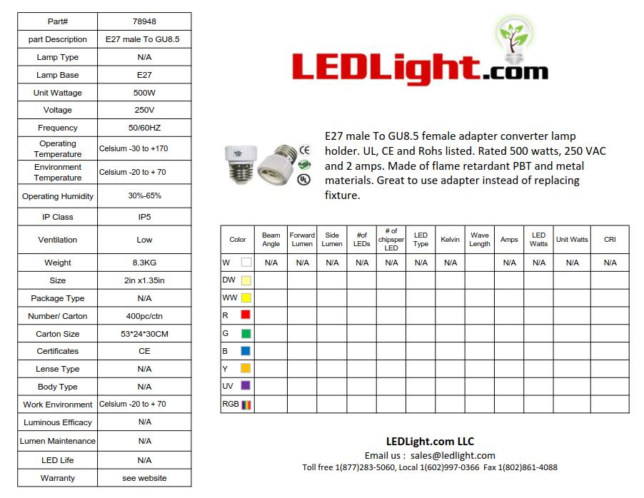 E27 male To GU8.5 female adapter converter lamp holder. UL, CE and Rohs listed. Rated 500 watts, 250 VAC and 2 amps. Made of flame retardant PBT and metal materials. Great to use adapter instead of replacing fixture.