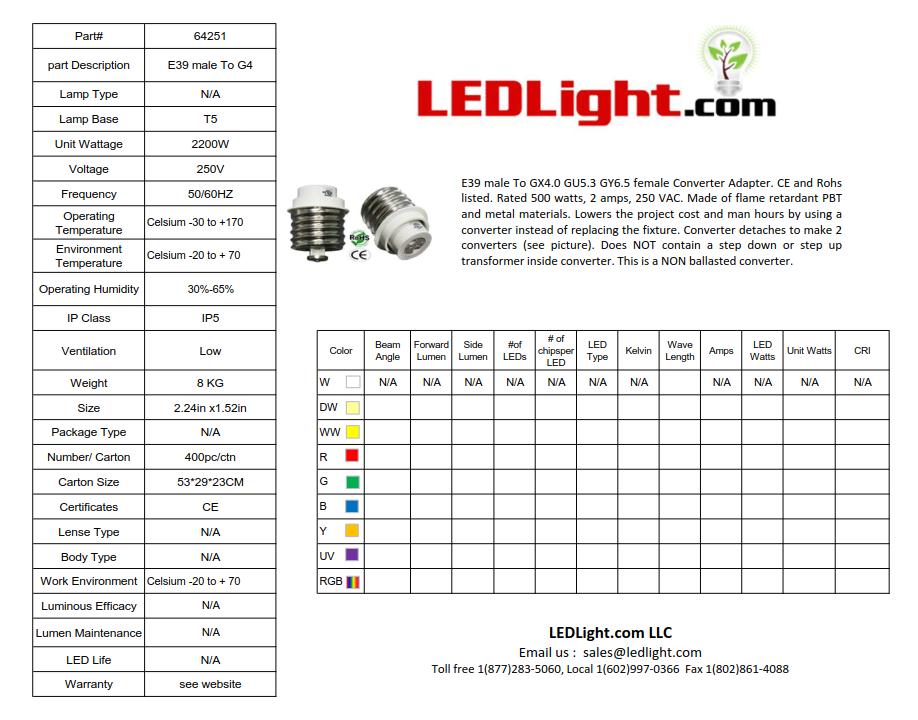 E39 male To GX4.0 GU5.3 GY6.5 female Converter Adapter. CE and Rohs listed. Rated 500 watts, 2 amps, 250 VAC. Made of flame retardant PBT and metal materials. Lowers the project cost and man hours. Fits G4, MR11, MR16. This is a NON ballasted converter.