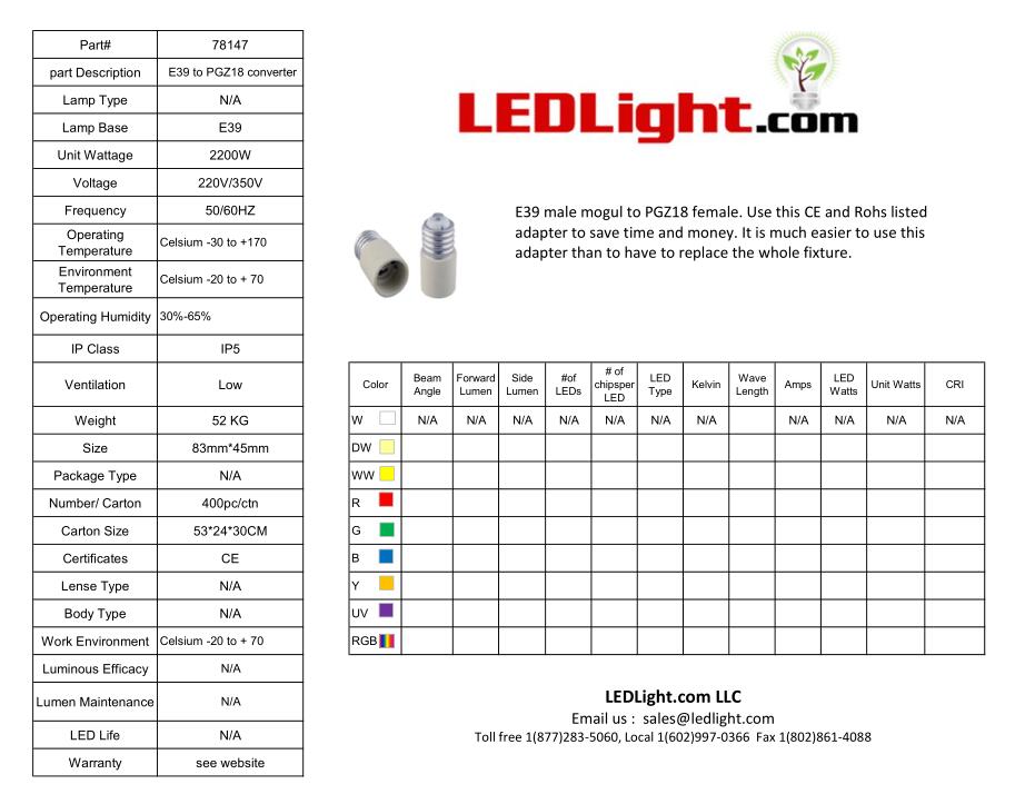 E39 male mogul to PGZ18 female ceramic converter. Use this CE and Rohs listed adapter to save time and money. It is much easier to use this adapter than to have to replace the whole fixture. Rated up to 6 kV T270. Rated up to 5A. Rated up to 250V. Compatible with Bersn. This is just a converter that has no electronics, just two conductors from E39/E40 to PGZ18.