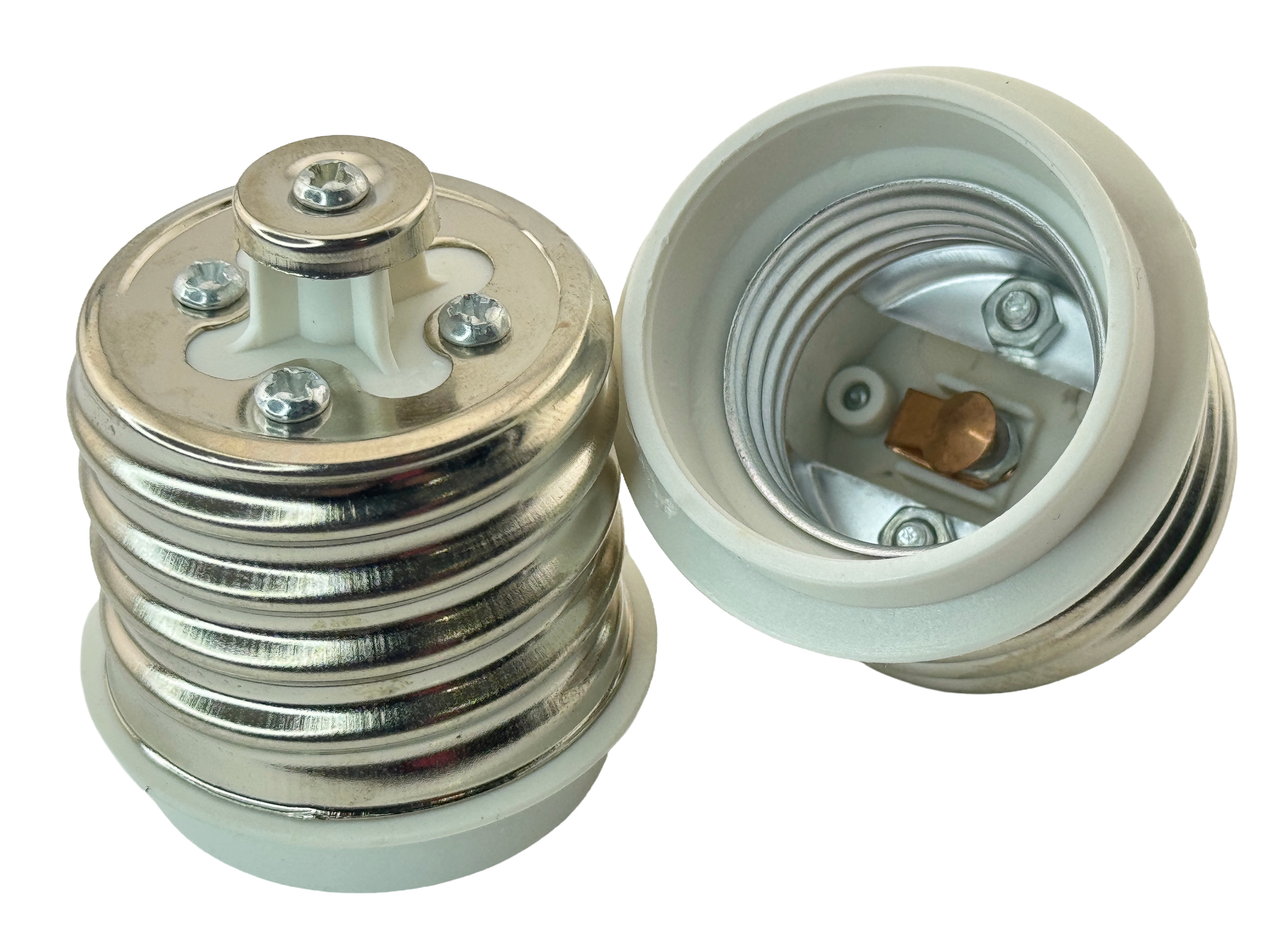 E27 (male) to E39 (female) adapter. Use this adapter to convert E27 to E39 Mogul base. CE and Rohs listed. Made of flame retardebt PBT and copper materials. Rated power 2200 watts, 250VAC, 10 amps.