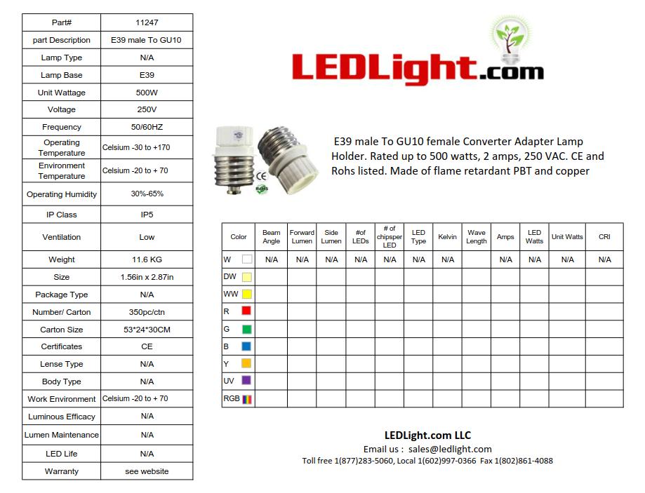 E39 male To GU10 female Converter Adapter Lamp Holder. Rated up to 500 watts, 2 amps, 250 VAC. CE and Rohs listed. Made of flame retardant PBT and copper materials.