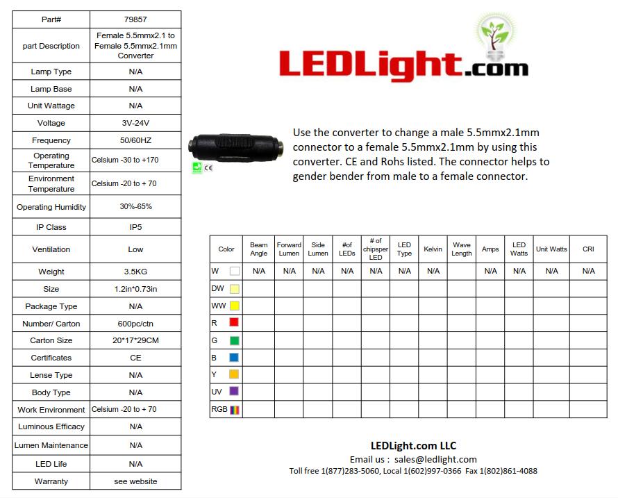 Use the converter to change a male 5.5mmx2.1mm connector to a female 5.5mmx2.1mm by using this converter. CE and Rohs listed. The connector helps to gender bender from male to a female connector.