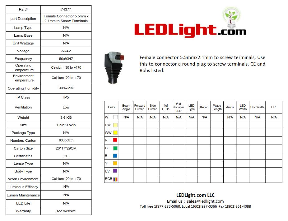 Male 5.5 mm x 2.1 mm connector Low Voltage DC Water Resistance. Connect wires to the other side using screw terminals, tightened by standard screw driver. Fits many LEDLight.com products.
