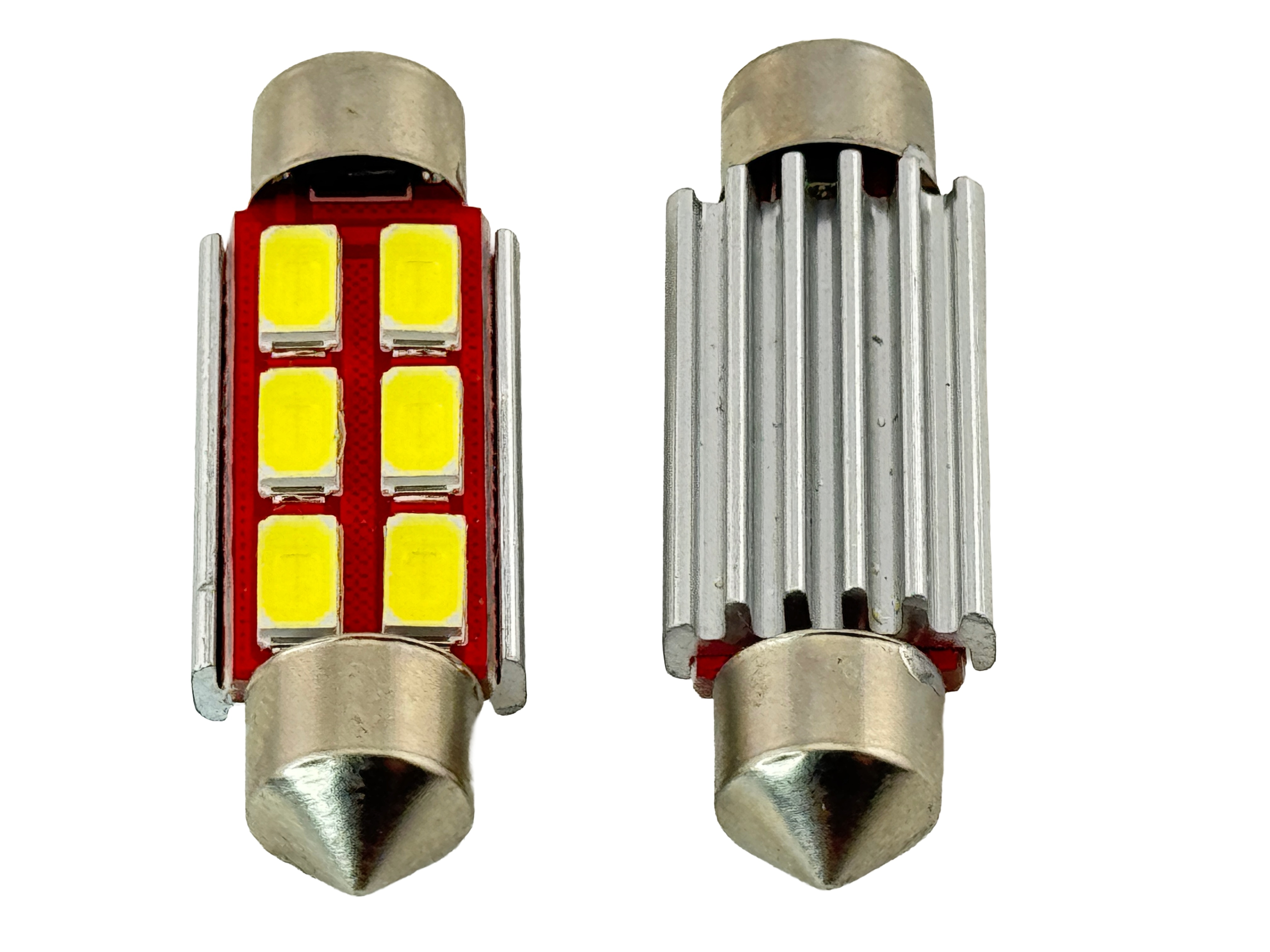 Festoon 39mm 3 Watt 6 x 5730 SMD 24V AC/DC 1 1/2 inch. Up to 240 Lumen output. Uses a metal heatsink to keep the leds cooler. Made with Samsung leds for long life. Uses 6 smd 5730 smd's. Available in White 6000K and Warm White 3000k. Long life up to 30,000 hours. About 1 1/2 inches long. CE and Rohs. Dim-able with a variable voltage supply. Compatible with: 5wxenon