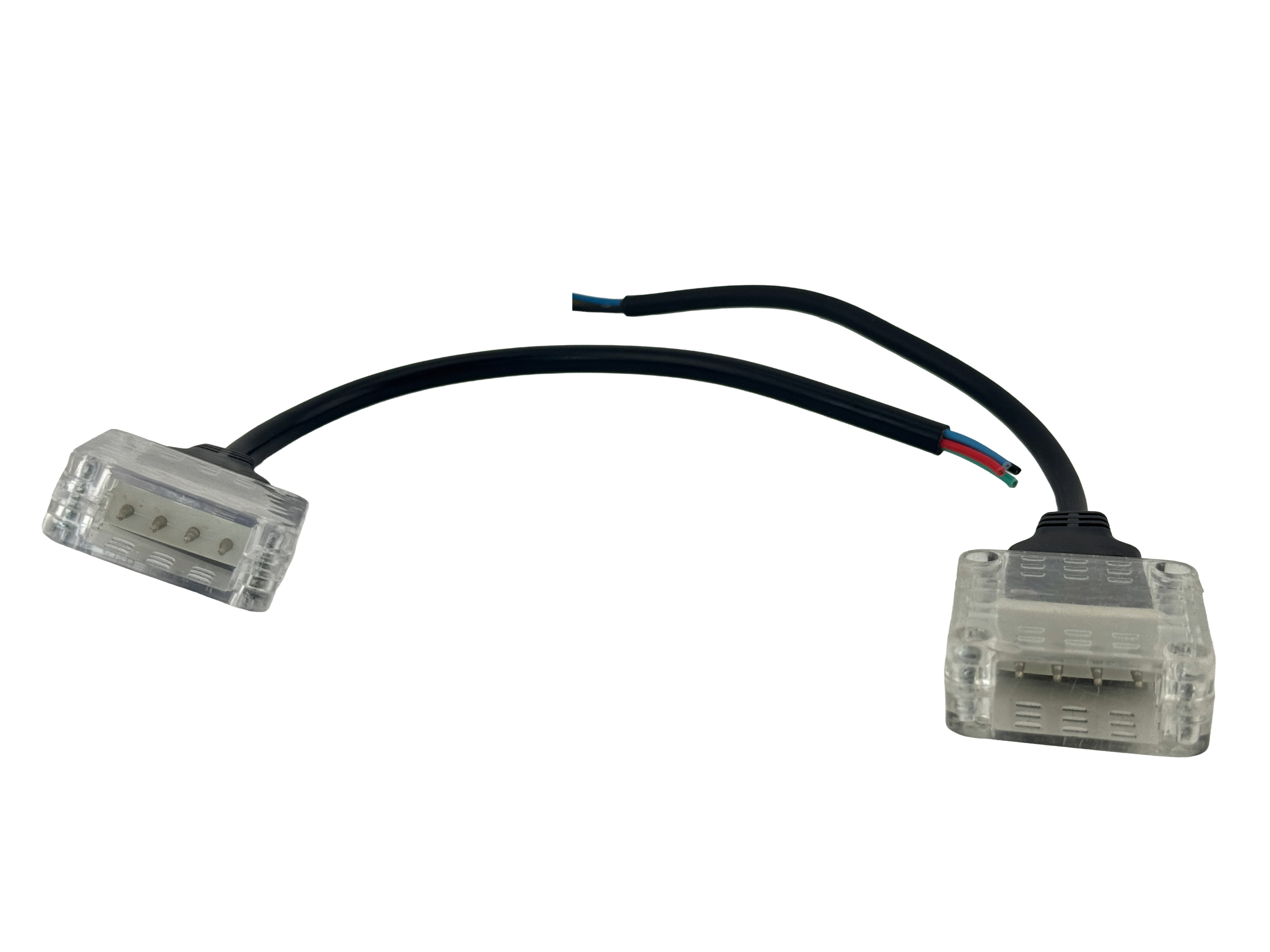 Rebaydo 2 pcs Flat LED Rope Light RGB Power Harness are designed to connect RGB flat LED rope lights to a power supply or RGB controller, providing a professional and organized connection. The harness features a 4-pin flat connector with common anode (+12V DC) and separate inputs for Red, Green, and Blue channels. Dimensions are approx. 9 inches wire length × approx. 1.56 inches connector width × approx. 1.93 inches connector length × approx. 0.60 inches connector height, with approx. 0.2 inches pin spacing. Rated for approx. +12V DC. CE, RoHS Listed.