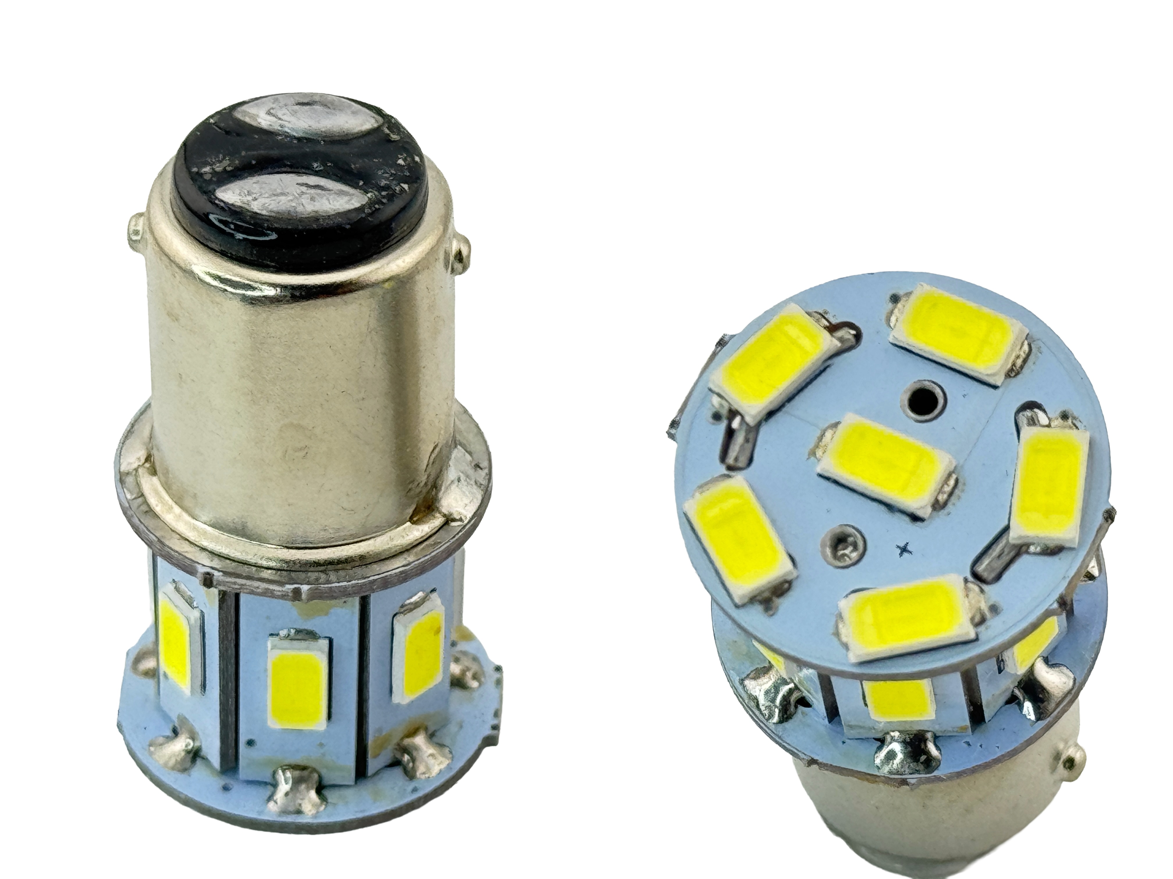 2 pcs 1158 BA15D LED Bulb are designed for vintage and classic vehicle applications using approx. 6–12V DC negative ground systems, featuring dual brightness levels for tail light and brake light operation. Utilizes 5730 SMD LED chips for high brightness and long service life with approx. 360 degree illumination and a form factor similar to traditional incandescent bulbs. Produces up to approx. 270 lumens for tail light and approx. 320 lumens for brake light, comparable to approx. 25 to 35 watt incandescent bulbs, with power consumption up to approx. 2.6 watts and rated lifespan up to approx. 30000 hours. This BA15D base has approx. 15 mm diameter with even-height bayonets, unlike 1157 bulbs which have offset pins, and if the tail light appears brighter than the brake light, rotate the bulb 180 degrees. These bulbs do not include load equalizers, which may be required to prevent hyper flashing or bulb-out warning errors. Dimensions are approx. 1.47 inches length × approx. 0.78 inches bulb diameter × approx. 0.59 inches base diameter. CE and RoHS listed.