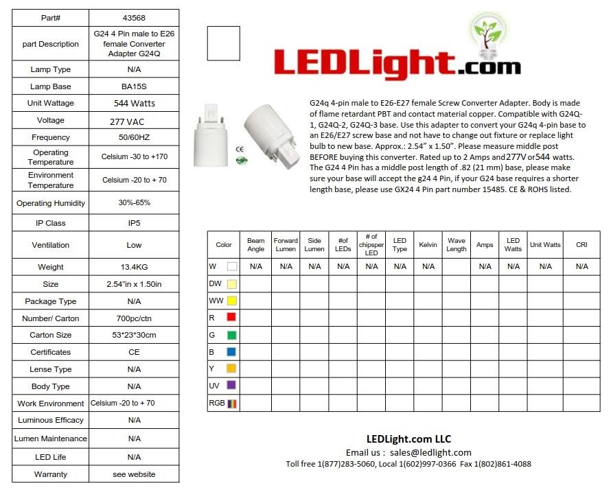 G24 4-pin male to E26 female converter. Use this adapter to convert to a E26 screw base and not have to change out fixture or replace the bulb to new base. Approx. size 2.54” x 1.50”. Please measure middle post BEFORE buying this converter. Rated up to 2 Amps and 277V or 544 watts. The middle post length of .82 (21 mm) base requires a shorter length base, please use GX24 4 Pin part number 15485. The starter and/or ballast will need to be bypassed. Common Questions: Can I use a G24 base plug into the existing Gx24 fitting ? The answer is NO they are not interchangeable converter sockets. The LED common base fits all sockets regardless of the notches/keying tabs. This converter works with Edison Medium base E26 based male bulbs rated up to 500 watts. Please Note: You will need to BYPASS the BALLAST in your SYSTEM for this converter to work properly. Measure existing bulbs middle post BEFORE buying this converter to ensure proper fit. Perfect for use on fixtures that use a PL-C bulb, that you want to use a normal bulb. Compatible with G24Q-1, G24Q-2, G24Q-3. Body is made of flame retardant PBT and contact material copper. Includes one product per package. CE and Rohs certified. Compatible with: Sylvania Lighting CF26DD/E/835/ECO/, Generic CFQ26W/G24q/835, Philips Lighting PL-C26W/835/4P/ALTO, GE Lighting F26BX/SPX35/4P