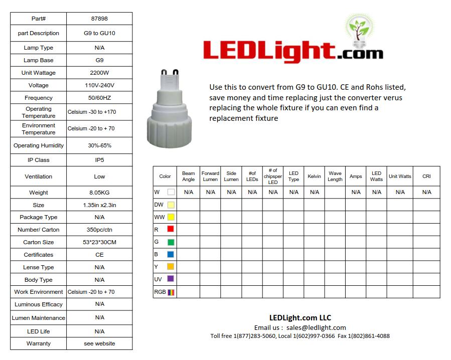 GU10 (Male) To G9 (Female) Converter/Adapter. This adapter saves time and money using this product versus changing out the fixture. UL, CE and ROHS listed.