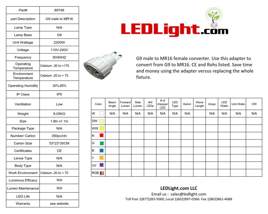G9 male to MR16 female converter. Use this adapter to convert from G9 to MR16. CE and Rohs listed. Save time and money using the adapter versus replacing the whole fixture.
