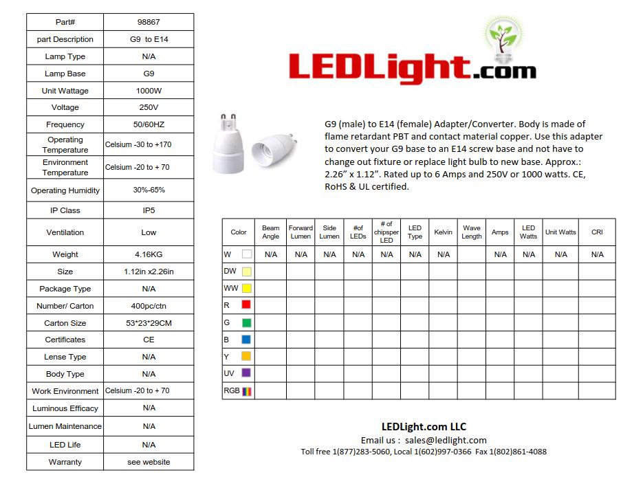 G9 male to E14 female Adapter Converter. Body is made of flame retardant PBT and contact material copper. Use this adapter to convert your G9 base to an E14 screw base and not have to change out fixture or replace light bulb to new base. Approx.: 2.26” x 1.12”. Rated up to 6 Amps and 250 Volt AC or 1000 watts. CE, Rohs certified.