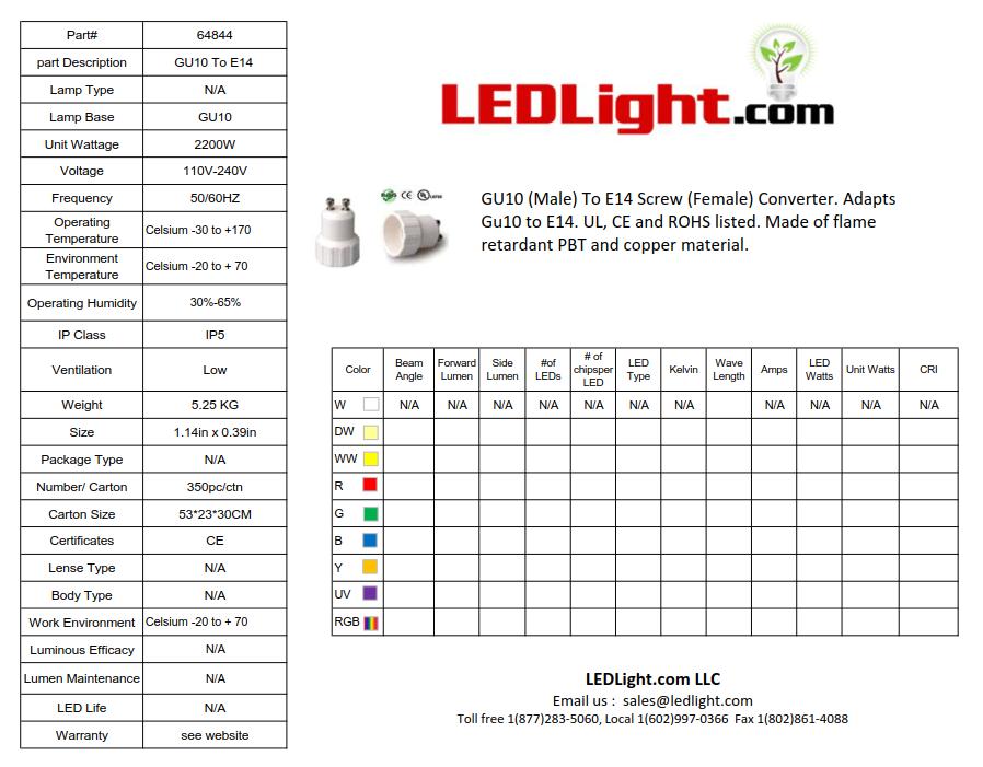 GU10 (Male) To E14 Screw (Female) Converter. Adapts Gu10 to E14. UL, CE and ROHS listed. Made of flame retardant PBT and copper material.