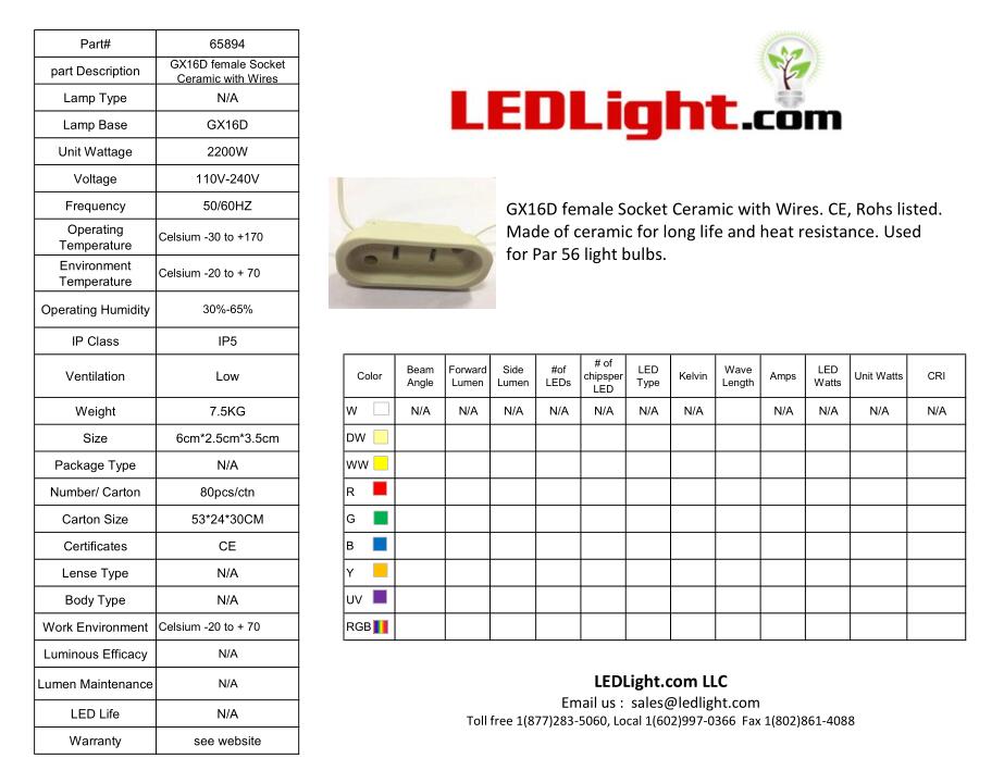 GX16D female Socket Ceramic with Wires. CE, Rohs listed. Made of ceramic for long life and heat resistance. Used for Par 56 light bulbs. The wires are about 8 inches long. The wire is made of up to 14 AWG. The insulation is silicon rubber and the wire is tinned conductor. The wire is the same type of wire used for appliances, so it can withstand heat. Rated at 600V. The insulation diameter is 30 mils. The rated wattage is 1500 Watts. 5KV pulse rated.