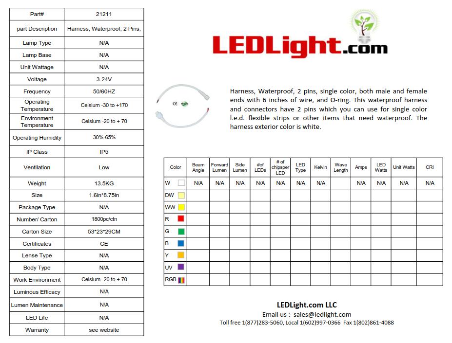 Harness, Waterproof, 2 pins, single color, both male and female ends with 6 inches of wire, and O-ring. This waterproof harness and connectors have 2 pins which you can use for single color l.e.d. flexible strips or other items that need waterproof. The harness exterior color is white.