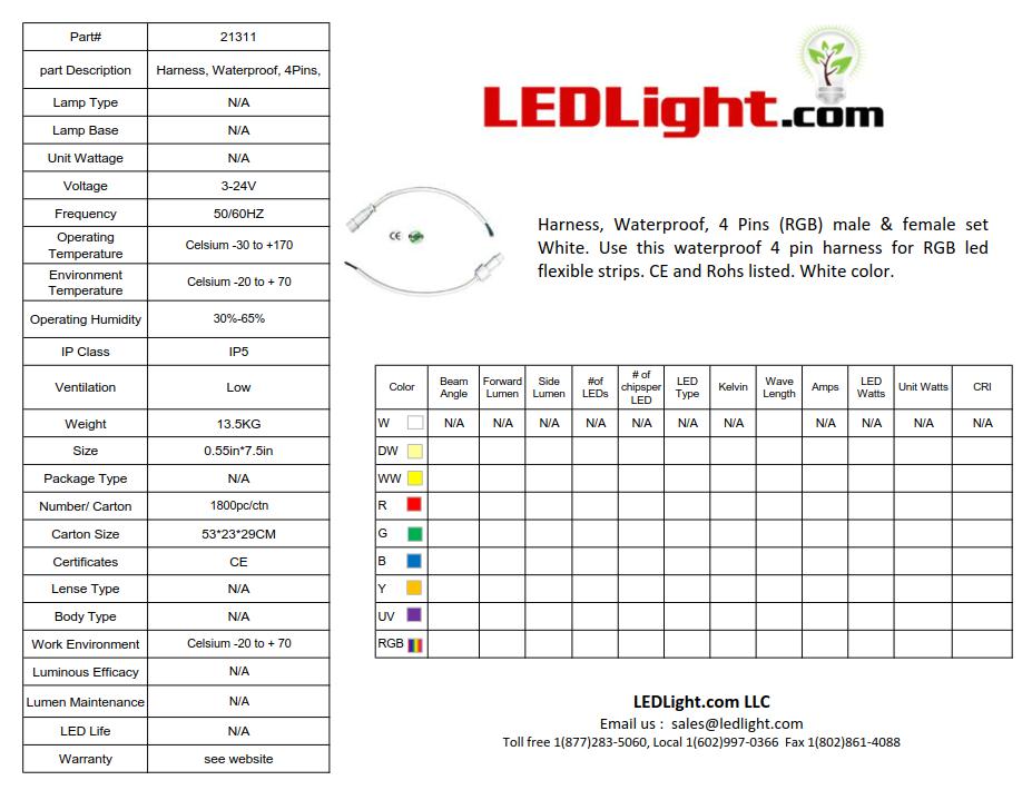Harness, Waterproof, 4 Pins (RGB) male & female set White. Use this waterproof 4 pin harness for RGB led flexible strips. CE and Rohs listed. White color. The wire is about 6" long on the female side of the harness. The wire is about 6" long on the male side of the harness. Comes with a O-ring gasket to seal the harnesses.