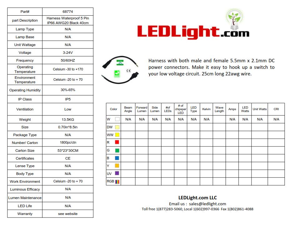 Harness waterproof IP66 Black, 5 Pin, 20 awg, 40cm long. Works to waterproof connectors that could get wet. CE and Rohs listed. Water resistant, easy to connect.