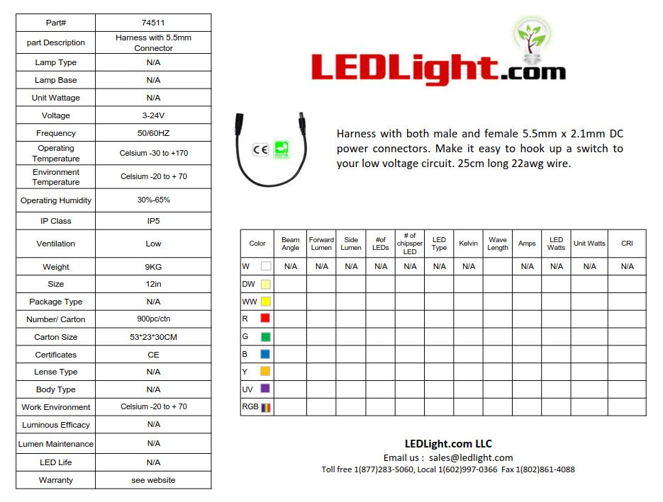 Female 5.5mm x 2.1mm DC Water Resistant Connector harness. Wire connects to screw down terminals. Fits all LEDLight.com products that have the 5.5mm connector male and female. Approximate size female plug 5.54mm and 2.15 tip.