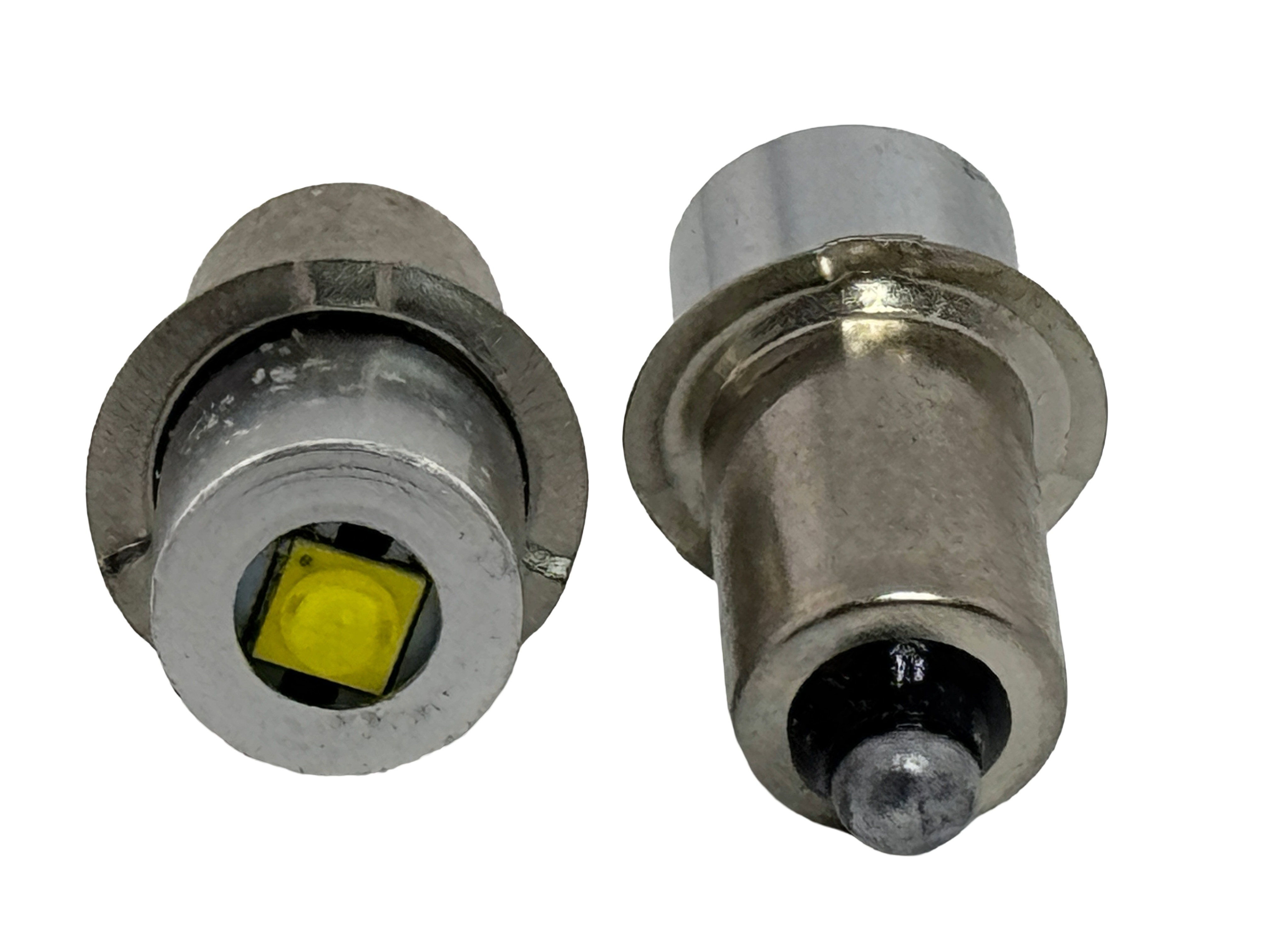 Rebaydo 2pcs LED Flashlight Bulb P13.5S 3W 6-24V. Up to 200 Lumens. Long life up to 30,000 hours. Comparable to a 27 Watt incandescent bulb. Available in White 6000K and Warm White 3000K. Works AC/DC Replace your broken incandescent bulb with a virtually unbreakable led bulb. The ring is 13.5mm. The length is 14mm. Extends battery life up to 9 times what a incandescent bulb would use. Starts to illuminate at 5.11 volts. Uses about 0.291 amps at 6 volts. Uses about 0.077 amps at 24 volts. CE and Rohs.