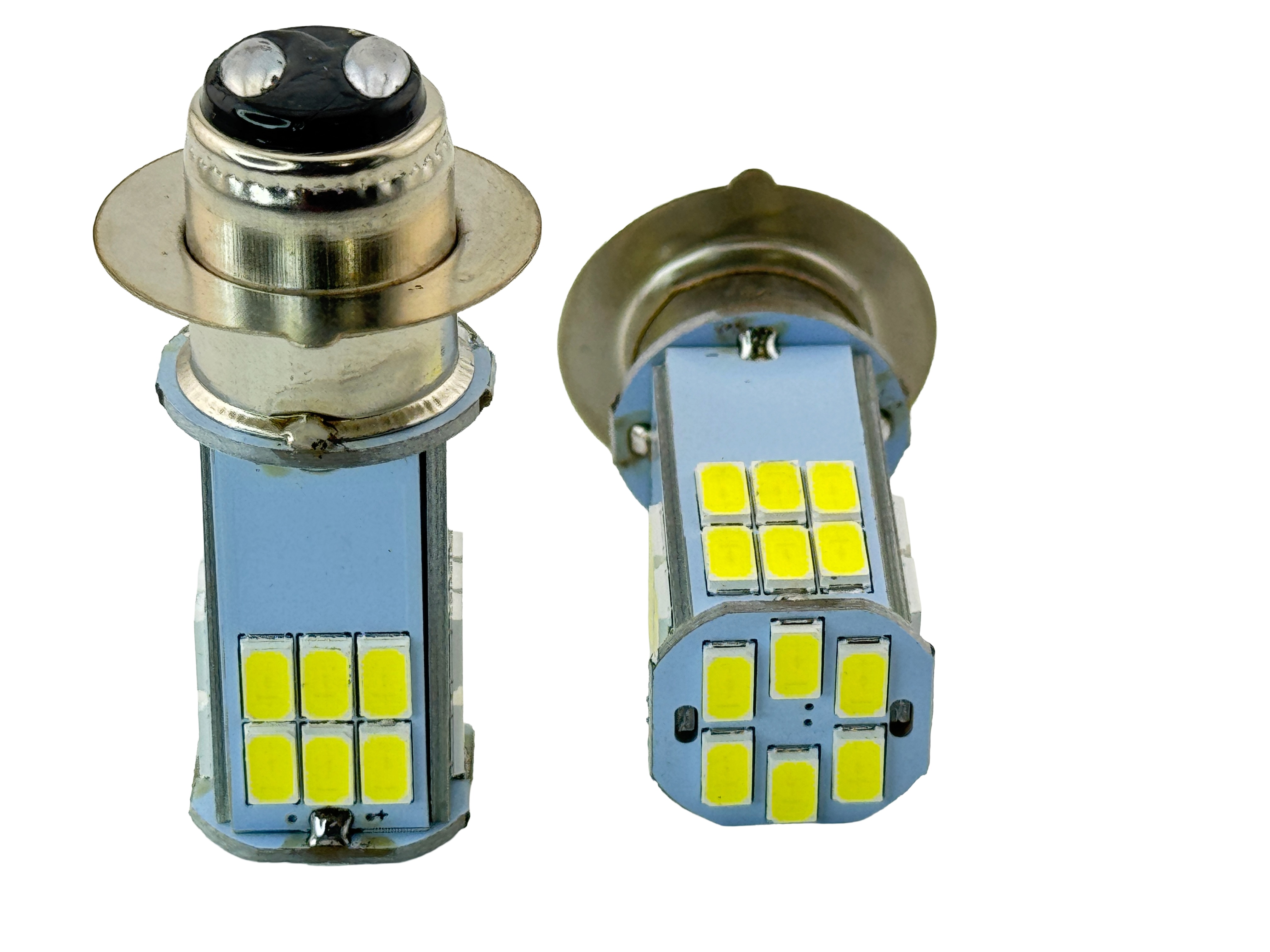 Rebaydo 2pcs LED Headlight P15D-25-1 Base 6 Volt 30 SMD Dual Beam. T19 P15D-25-1 base led headlight. Up to 600 Lumen output. Dual filament Low and high beam. Long life up to 30,000 hours. The leds are optically aligned for best led light output using your reflective fixture. Please always clean the fixture when installing led light bulb. Comparable a 25 to 35 Watt halogen or incandescent bulb. The base is T19 P15D-25-1 base. This bulb operates either AC or DC. Operates at 6 volts, higher voltage with cause this bulb to fail. The bulb can operate up to 7.0 volts. Works either positive chassis or negative chassis. The M.O.L. maximum overall length is 1.976" and the M.O.D. maximum overall diameter is .747" not including the base diameter. CE and Rohs.