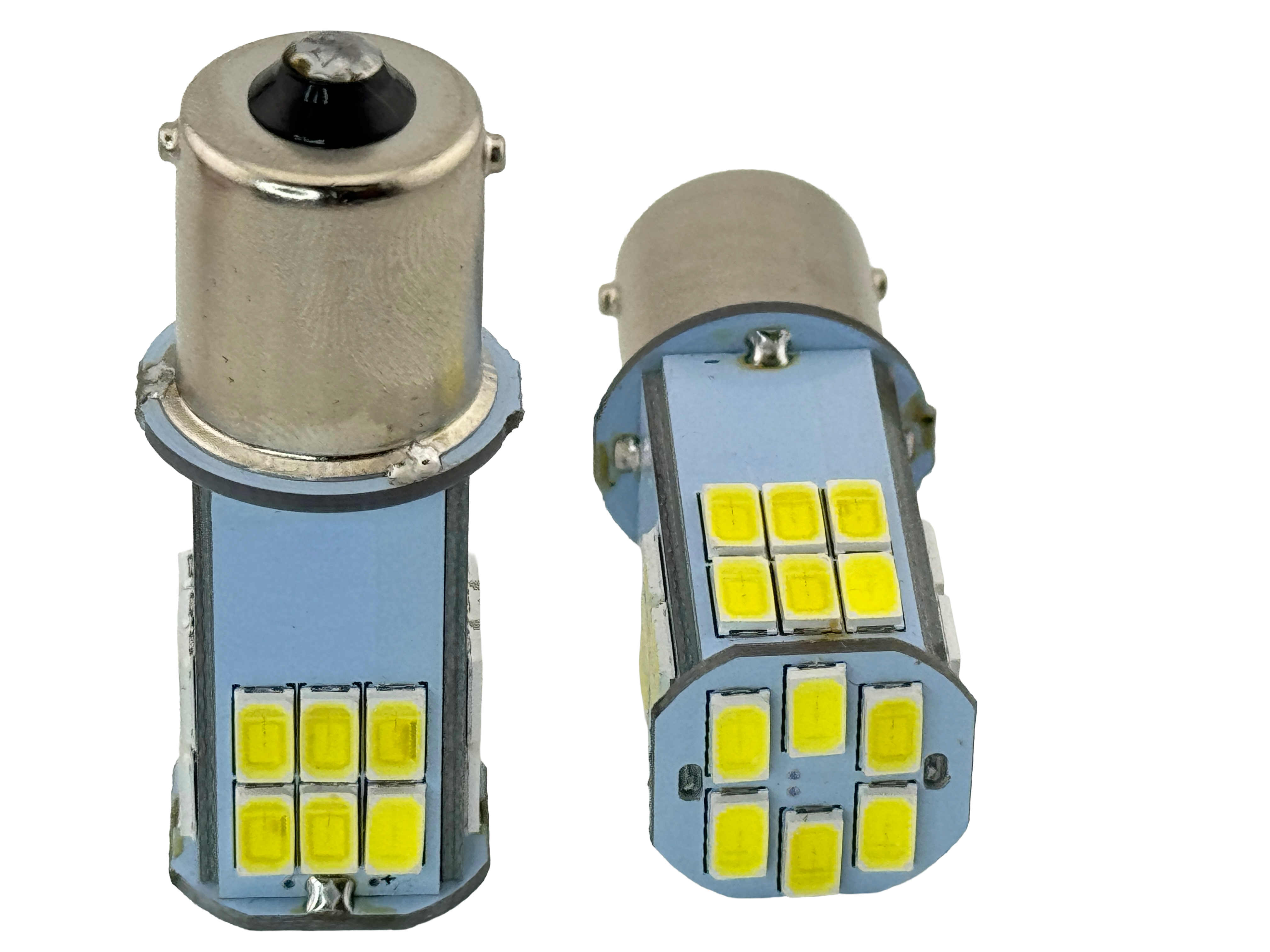 Rebaydo 2pcs LED Headlight 12 Volt BA15S Base 30 SMD Single Filament. LED Headlight 12 volt non polarity either positive ground or negative ground chassis. The base is BA15S, which has parallel bayonets same height and a single contact in a 15mm base. Long life up to 30,000 hours. Up to 650 Lumen output. Dim-able using a variable voltage supply. Available in white 6000k and warm white 3000k. Great for vintage and classic vehicles, motorcycles and trucks. The LED are optically aligned to the original filament location. The lamp is dimmable using a variable voltage source. Since the lights are dim-able they operate better when there is a low voltage condition. If you are updating your bulbs that are in the turn signal circuit we recommend using 6 ohm load equalizer for each led in the turn signals or a led compatible flasher. The M.O.L. maximum overall length is 1.962" and the M.O.D. maximum overall diameter is 0.741". Comparable to a 27 to 35 Watt incandescent bulb. The bulb has a total of 30 5730 smd led's. Each 5730 led can dissipate 1/2 Watt of power. Up to 6 Watts. CE and Rohs listed.