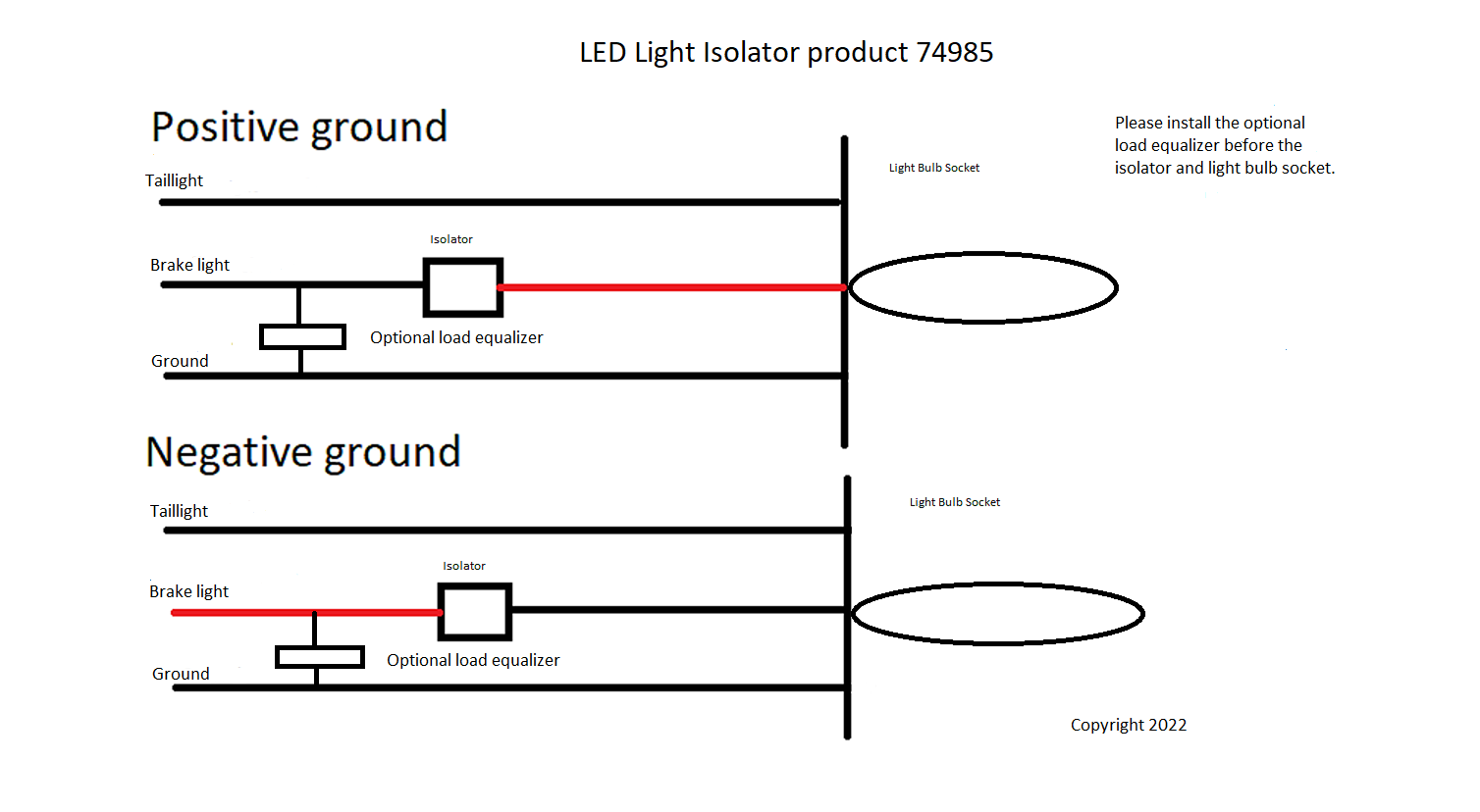 LED light isolator is used when the brake/turn light control module/switch asserts low signal for negative ground when not active or asserts high signal when not active for positive ground vehicles, trucks and motorcycles. This causes your brake lights not to work. Works for 6 Volt, 12 Volt or 24 Volt systems. Works for either positive ground or negative ground vehicles. Isolator rated for 10 Amps. Each isolator can dissipate 60 watts @ 6V, 120 Watts@12V and 240 Watts@24V. To install isolator you must cut brake light wire and splice the isolator inline in the brake light circuit. The wires are stranded 18 AWG. Comes with two I.D.C. insulation displacement connectors. No soldering required using the crimps. The wire length is 5" each side for a total of 10" for both sides. The isolator diameter is approximately .4" diameter and .4" in length. The isolator is polarity sensitive depending if negative ground or positive ground. For negative ground please have the black wire connect to your light socket. For positive ground please have the red wire connect to the light socket. Please view the specification sheet link for the wiring diagram. If the taillights are not lighting then install the isolator for each LED bulb in the brake light circuit. Please make sure to install the optional load equalizers on the black wire side for positive ground vehicles or install the optional load equalizers on the red wire side for negative ground vehicles. Should also stop back feeding voltage. CE and Rohs. Works for 1954 Chevrolet Bel Air 6 Volt negative ground, 1961 Austin Healey Sprite 12 Volt positive ground.