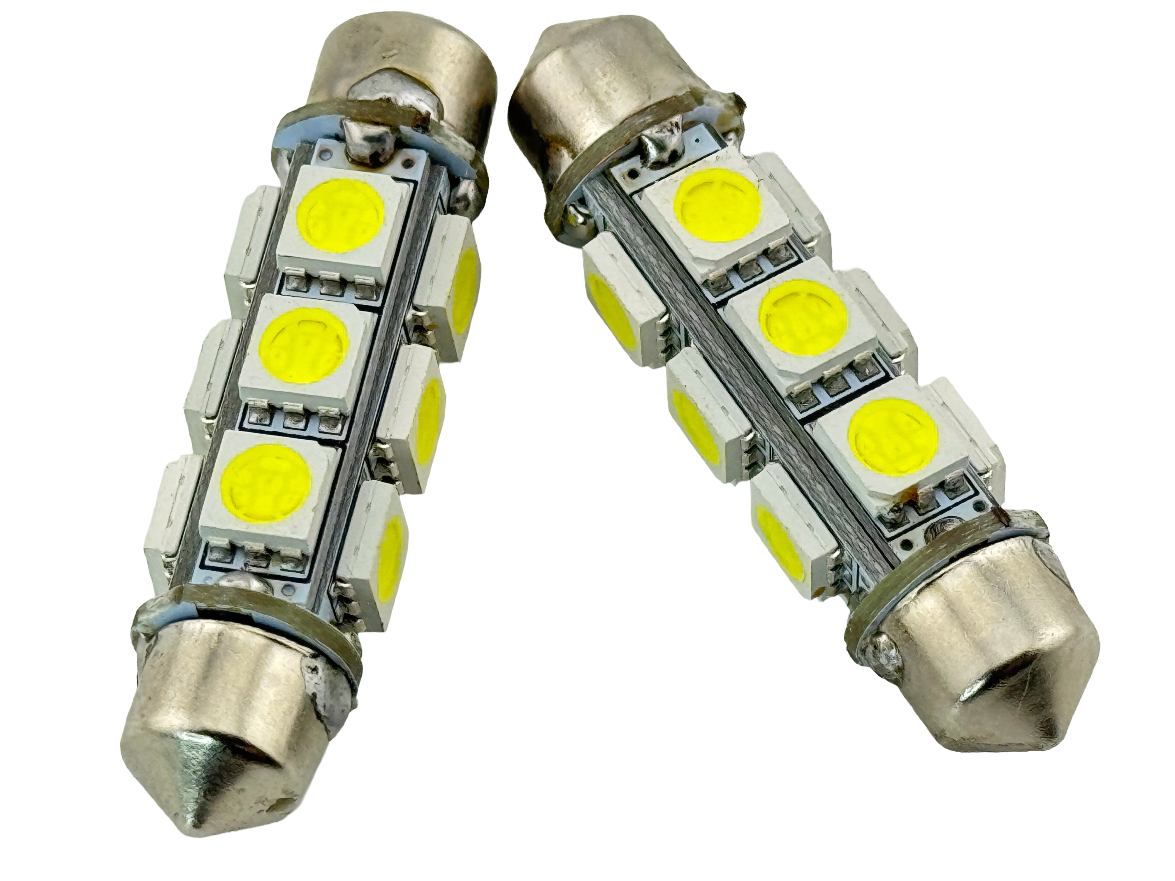 2.88 Watts @ 12 volts D.C. Up to 170 lumen, 1 3/4" 360 Degree Festoon with 12 5050 SMD 3 chip led's. 12 volts D.C. Great for license plate, dashboard and boat, airplane navigation. 42 mm. Very bright festoon that emits LED Light in 360 degree around the the festoon. Great for boats and other navigational systems that need bright lighting in al directions. DE3021 / DE3022 / DE3175 / 212 / 12844 / K25623. Available in White, Warm white, Red, Green, Blue and Yellow. This L.E.D. bulb has 360 degree illumination. Has the same shape as a incandescent festoon so it fits in most applications. Very bright and well made. Two festoons per order.