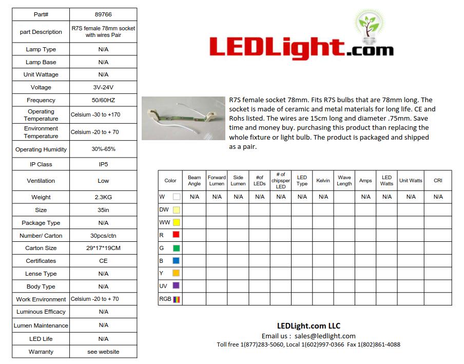 R7S female socket 78mm. Fits R7S bulbs that are 78mm long. The socket is made of ceramic and metal materials for long life. CE and Rohs listed. The wires are 15cm long and diameter .75mm. Save time and money buy. purchasing this product than replacing the whole fixture or light bulb. Rated 250VAC. Rated at 1,000 Watt. Rated 2 to 4 Amp.