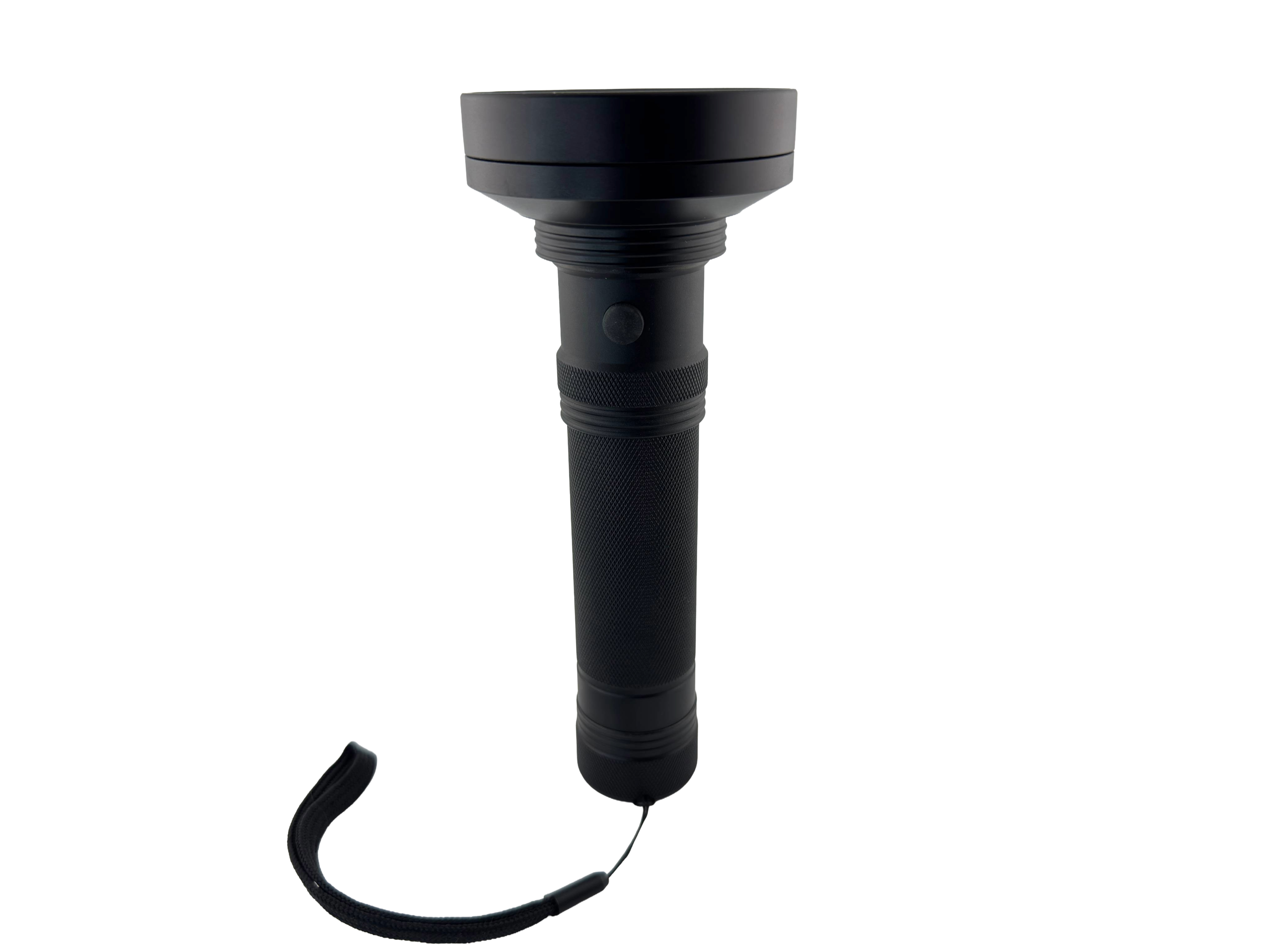 100 LED Flashlight. The UVA wavelength is 395-400nm. The body is made of black anodized Aluminum alloy. Uses 6 AA batteries that are not included. Great for hunting for scorpions. There is a switch in the neck of the flashlight. Please push the switch on to light the flashlight and push off to turn off the flashlight. The flashlight is approximately 7.67" long. The maximum diameter of the flashlight is 3.15". The diameter of the body of the flashlight is 1.30". Please make sure to install the battery holders in the correct direction with the "+" pointing to the end of the flashlight. The battery holders are installed from the bottom of the flashlight. The lanyard in approximately 6" long.