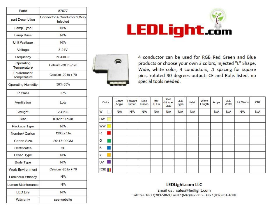 4 conductor can be used for RGB Red Green and Blue products or choose your own 3 colors, Injected "L" Shape, Wide, white color, 4 conductors, .1 spacing for square pins, rotated 90 degrees output. CE and Rohs listed. no special tools needed.