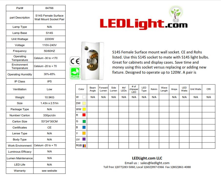 S14S Female Surface mount wall socket. CE and Rohs listed. Use this S14S socket to mate with S14S light bulbs. Great for cabinets and display cases. Save time and money using this socket versus replacing or adding new fixture. Designed to operate from 35W up to 120W. A pair is provided for each bulb.