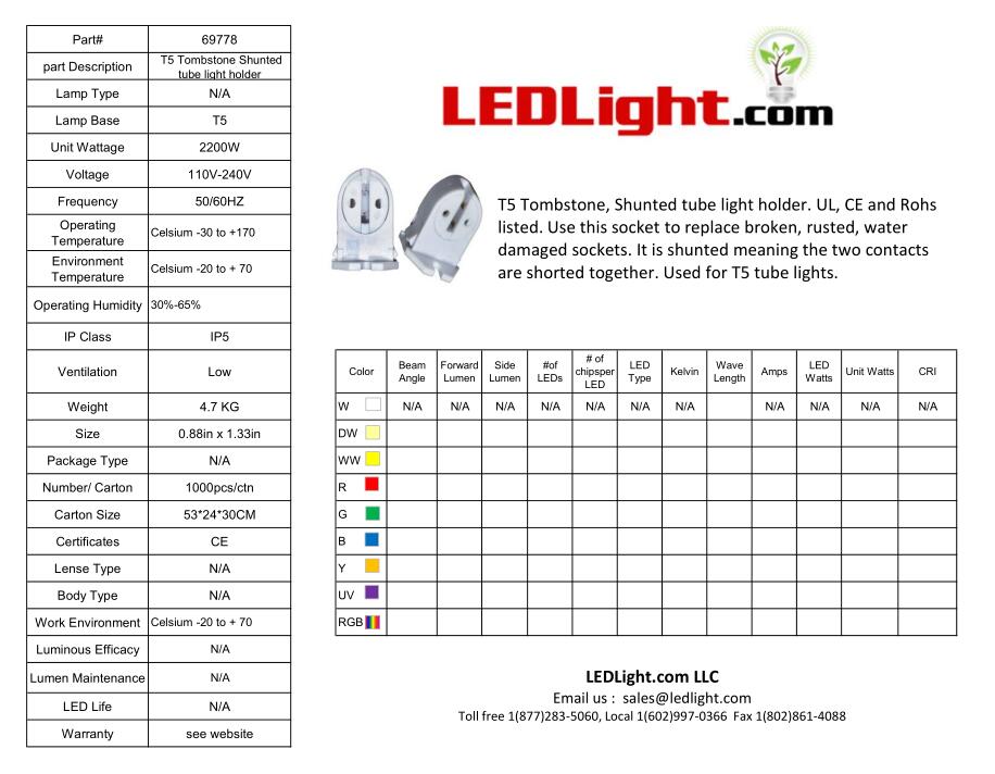 T5 Miniature bipin female socket. This Tombstone is a Shunted tube light holder. CE and Rohs listed. Use this socket to replace broken, rusted, water damaged sockets. It is shunted meaning the two contacts are shorted together. Used for T5 tube lights. This bi-pin socket is made of plastic.