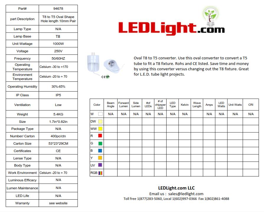 Oval T8 to T5 converter. Use this oval converter to convert a T5 tube to fit a T8 fixture. Rohs and CE listed. Save time and money by using this converter versus changing out the T8 fixture. Great for L.E.D. tube light projects. Converts T12 to T5.