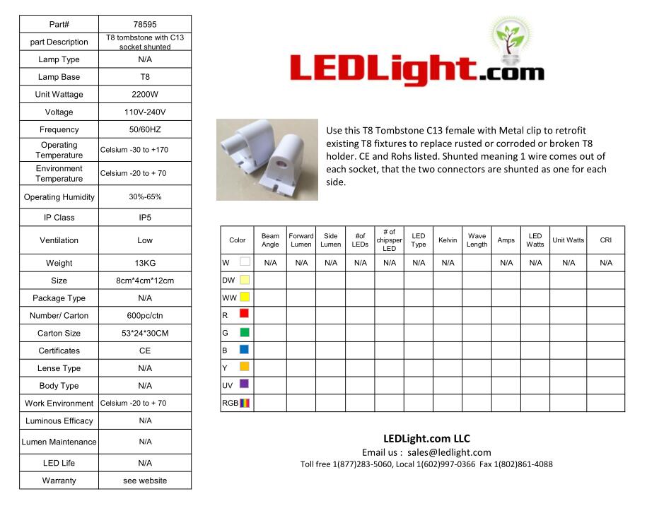 Use this T8 Tombstone C13 female with Metal clip to retrofit existing T8 fixtures to replace rusted or corroded or broken T8 holder. CE and Rohs listed. Shunted meaning 1 wire comes out of each socket, that the two connectors are shunted as one for each side.