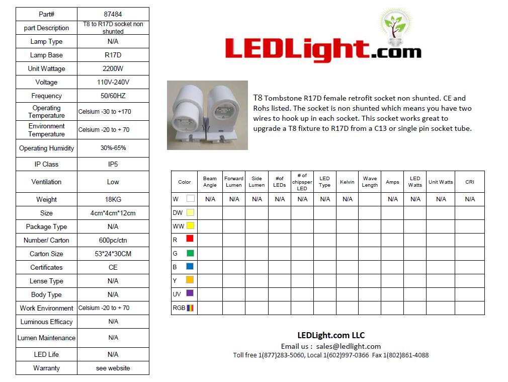 T8 Tombstone R17D female retrofit socket which is non shunted. UL, CE and Rohs listed. The socket is non shunted which means you have two wires to hook up in each socket. This socket works great to upgrade a T8 fixture to R17D from a C13 or single pin socket tube. This product pricing is 1 R17D tombstone matched pair (1 plunger, 1 stationary). cUL listed. Rated up to 600W. Rated up to 600V. Rated up to 1.1 amps. This is a R17D socket adapter for installing R17D tubes into a fixture with R17D tombstones. There are 4 holes in the bottom of the socket which are QuickWire or Push-in connectors. 2 Holes on the right side and 2 holes on the left side. Each side 2 holes are connected to each other. These 2 holes on each side connect to 1 contact of the G13 socket. The other side of the tombstone socket goes to the other two holes that align with the R17D contact. So two holes on the left connect to the left side G13 contact. The two holes on the right side connect to the ride side R17D contact. This socket is non shunted meaning the 2 R17D contacts are not connected together.