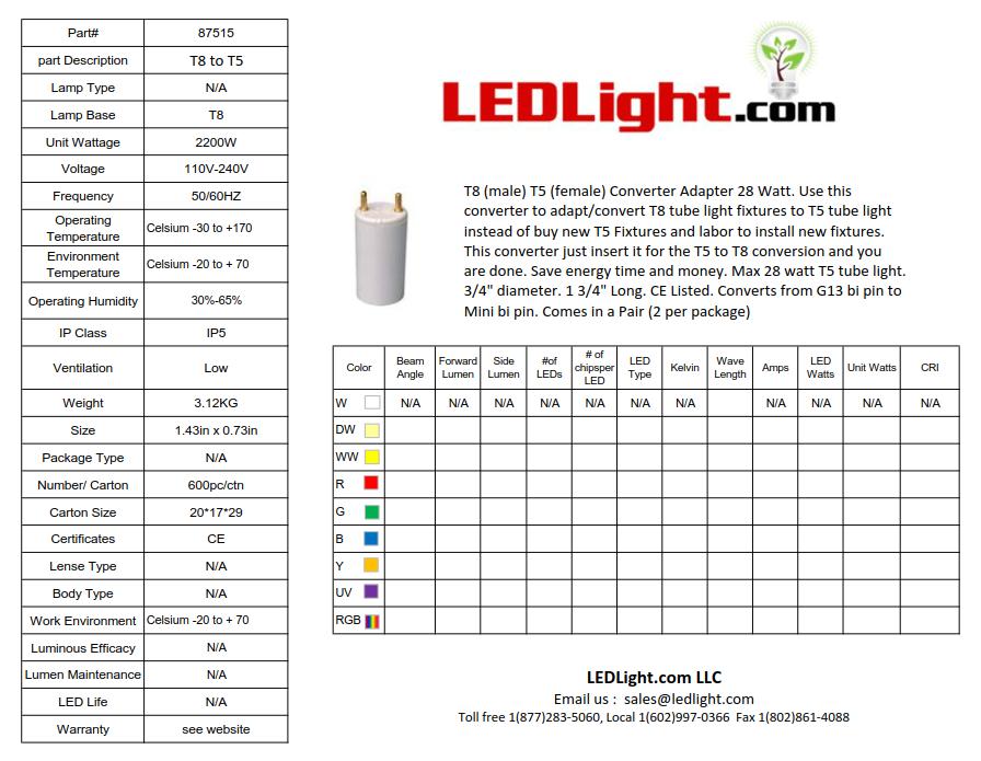 T8 (male) T5 (female) Converter Adapter. Use this converter to adapt/convert T8 tube light fixtures to T5 tube light instead of buy new T5 Fixtures and labor to install new fixtures. This converter just insert it for the T5 to T8 conversion and you are done. Save energy time and money. Rated up to 110 watts. Rated up to 220 volts. Rated up to 0.5 amps. 3/4" diameter. 1 3/4" Long. CE Listed. Converts from G13 bi pin to G5 Mini bi pin. Comes in a Pair (2 per package)