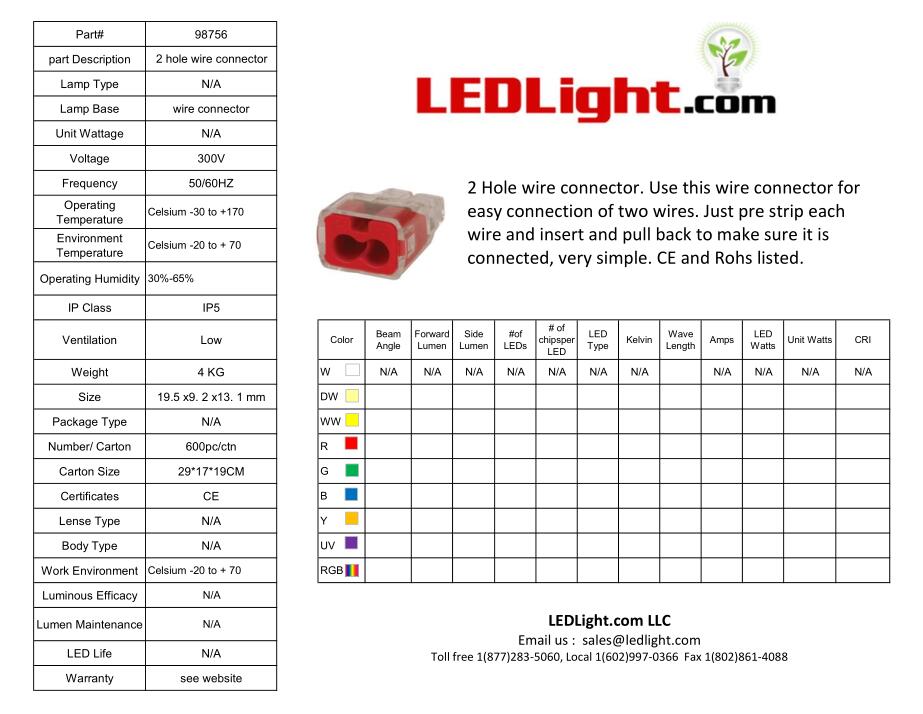 2 Hole wire connector. Use this wire connector for easy connection of two wires. Just pre strip each wire and insert and pull back to make sure it is connected, very simple solderless connection. The shell is made of flame resistance Insulated material Nylon PA66. The contact conductor is made of high-precision pure copper. The rated Voltage is up to 400V. The rated Current is up to 24A. The minimum cross section for wire conductor is 0.75 mm ² / 18AWG. The Maximum cross section for wire conductor is 2.5 mm ² / 12AWG. The product size: 20*13*9mm. CE and Rohs listed.